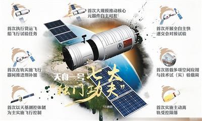 大約20多分鐘后,天舟一號飛行任務(wù)發(fā)射場區(qū)指揮部指揮長張學(xué)宇宣布,天舟一號貨運飛船發(fā)射取得圓滿成功。“根據(jù)北京航天飛行控制中心通報,長征七號火箭飛行正常,天舟一號貨運飛船已準(zhǔn)確進入預(yù)定軌道,太陽帆板展開正常。天舟一號發(fā)射獲得圓滿成功!”很多中國人把天舟一號貨運飛船親切地昵稱為“太空快遞員”,因為它承擔(dān)的是為未來空間站輸送貨物的任務(wù)。作為中國第一艘貨運飛船,天舟一號由貨物艙和推進艙兩部分組成,起飛質(zhì)量約為13噸,載荷能力達到了6.5噸。天舟一號貨運飛船系統(tǒng)副總設(shè)計師徐小平表示,作為載人航天工程三步走的重要組成部分,天舟一號的首飛意義重大:“貨運飛船是目前我們國家最大的飛行器,搭載了各種應(yīng)用載荷和航天員系統(tǒng)艙外活動實驗,為將來空間站大規(guī)模的空間應(yīng)用提供基礎(chǔ)。”
